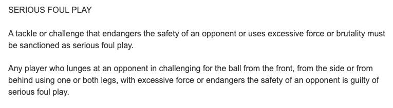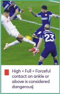 This season’s Premier League and PGMOL guidelines for serious foul play state that “High + Full + Forceful contact on ankle or above is considered dangerous”.